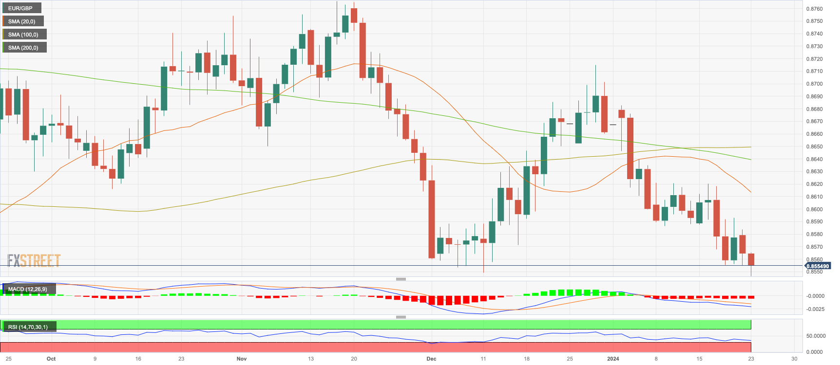 在周二的交易时段,欧元/英镑在触及 9 月低点 0.8545 附近以来的最低水平后稳定在 0.8555。欧盟委员会公布的消费者信心数据疲软,削弱了欧元的走势,而英镑则略占优势,因為市场对英国央行(BOE)2024 年放宽押注更小。