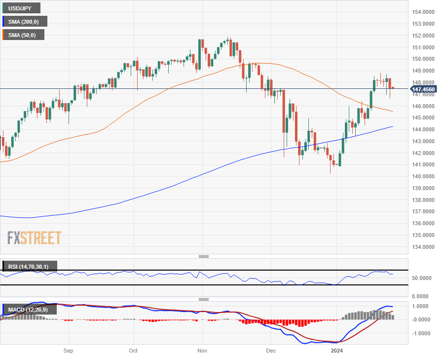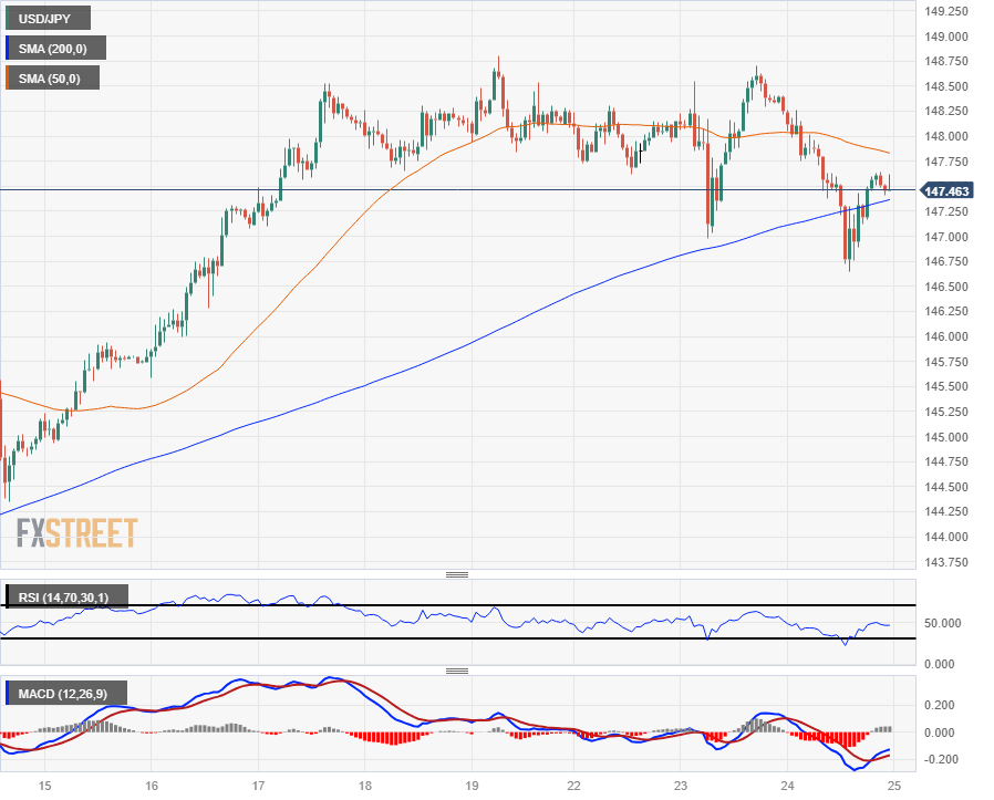 美元/日圆周三继遇阻200小时简单移动均缐(SMA)后,跌至146.80区域,随后反弹回到147.00关口上方,全天收于147.50附近。