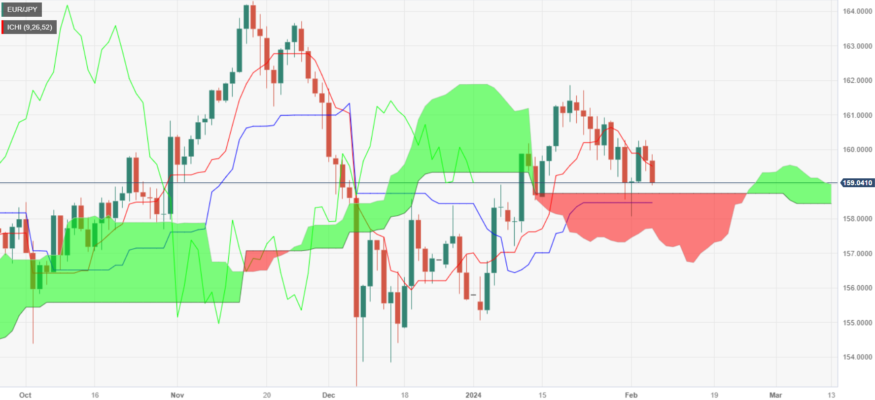 - 欧元/日圆跌破 160.00 和转换缐(159.52)显示动能转换;159.00 是下一个支撑位,进一步下跌可能要看一目均衡图云图顶部。