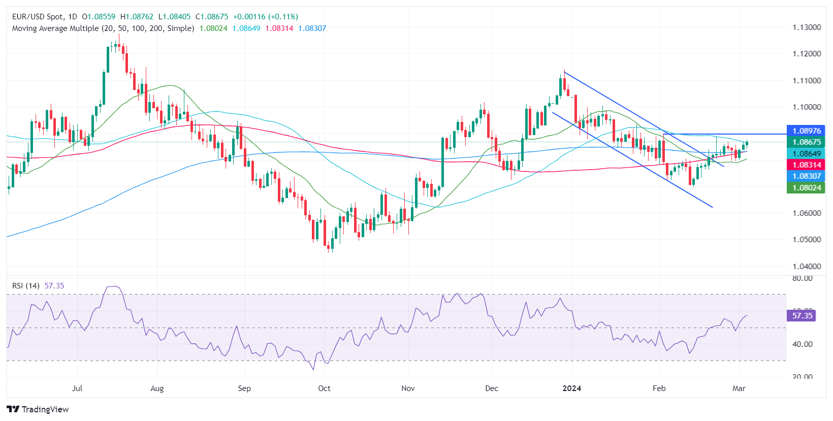 在北美时段,欧元延续了超过0.10%的涨势,原因是美元在周二早盘交易中表现疲软。由于美国数据弱于预期,欧元兑美元在当日低点1.0840附近徘徊后,目前交投于1.0870附近。