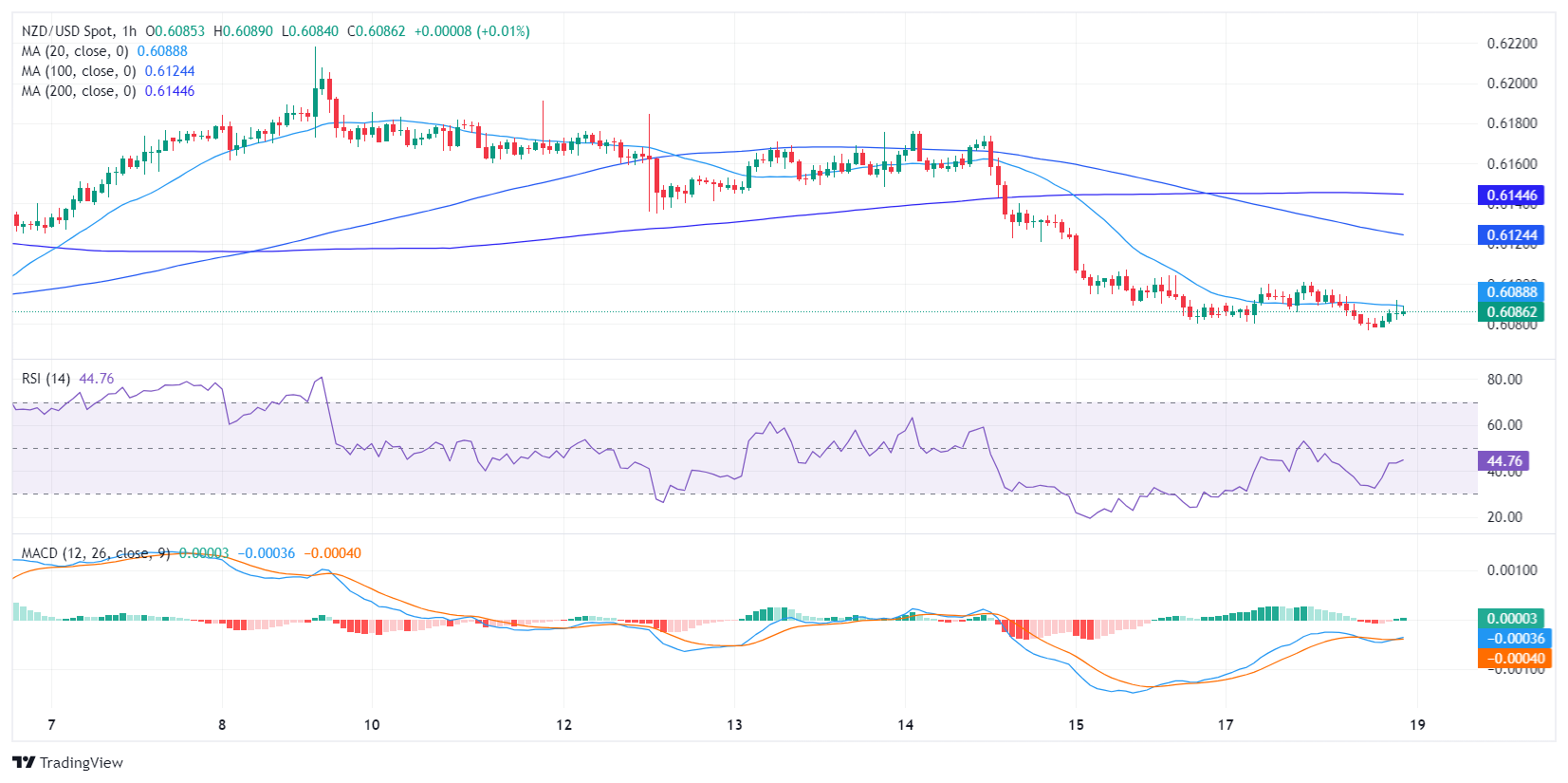从日缐图和小时图前景来看,在空头跌破 20 日和 100 日简单移动均缐(SMA)后,纽元/美元指向 200 日均缐,该水平构成强支撑。若多头无法守住该水平,整体趋势将转為看跌。