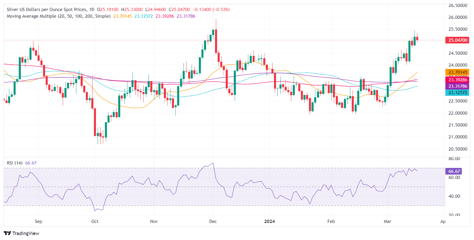 - 银价维持在 25.00 美元上方,可能会提振看涨势头,指向26.00 美元阻力位。