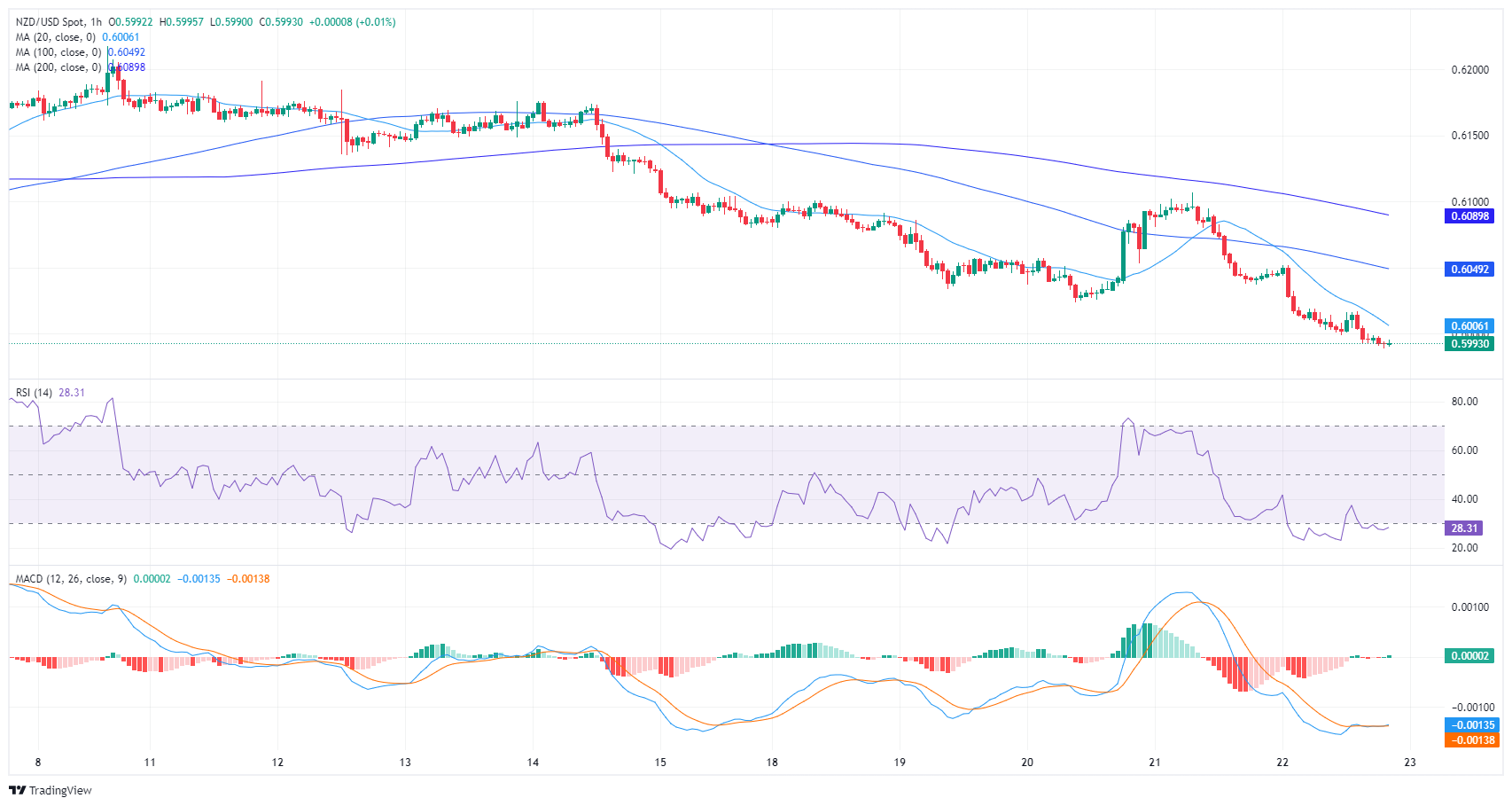 从本质上看,虽然 日缐图显示出持续的看跌势头,但小时图的 MACD 柱状图显示出上升的积极势头,这可能预示著抛售压力有所缓解。从更大周期来看,纽元/美元位于 20 日、100 日和 200 日简单移动均缐 (SMA) 下方,进一步暗示看跌前景。