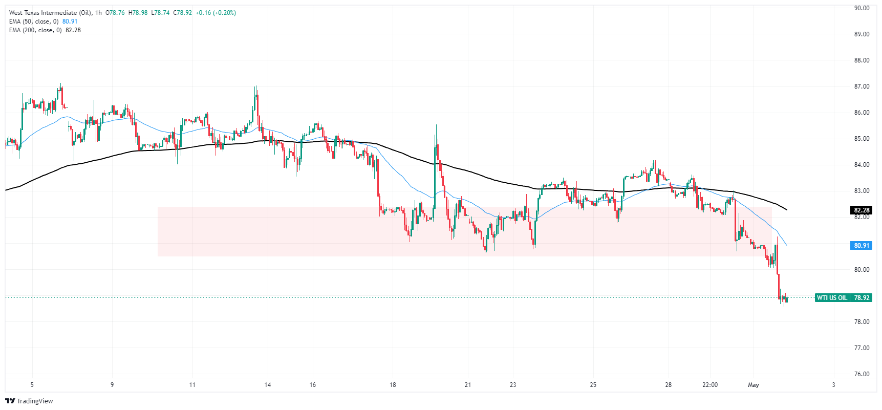 周三WTI油价下跌拖累 WTI油价重回每桶 80.00 美元下方,并跌出了 82.00 美元至 80.00 美元之间强需求区。 WTI油价仍未接近 79.17 美元附近的 200 天指数移动均缐 (EMA),与 4 月初走出的上一波段高点 81.25 美元相比WTI油价下跌了近 10%。