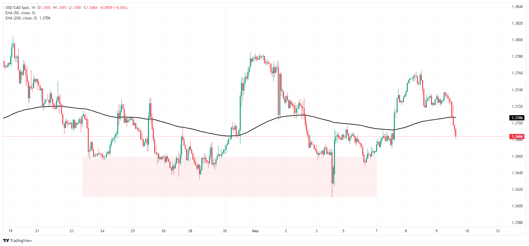 美元兑加币当日受拖累走低,回落至 200 小时指数移动平均缐(EMA)1.3708 下方,逼近 1.3660 至 1.3610 区域。本周的看涨波段从 1.3760 中断,波段高点难以守住。