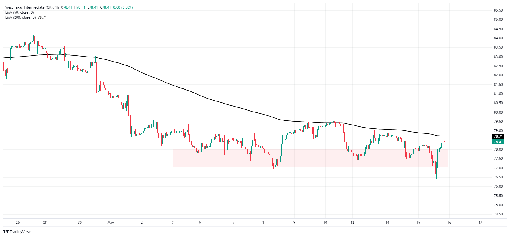 美国 原油周三跌至两个月低点 76.40 美元附近,跌穿近期需求区,随后迅速回升至 78.00 美元上方。 WTI油价依然看跌,交投于 78.70 美元的 200 小时指数移动均缐下方。