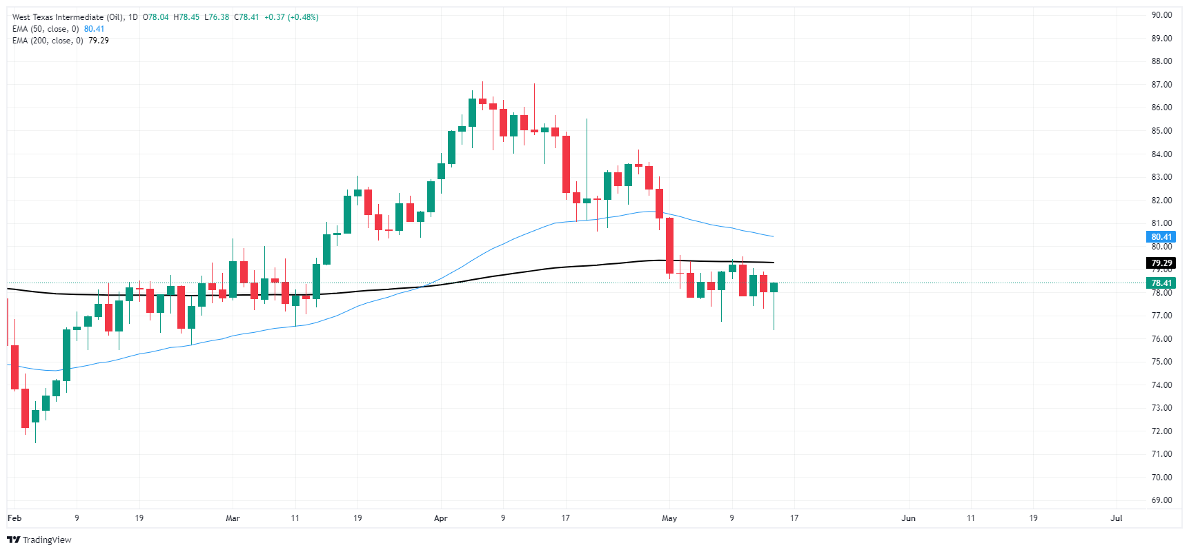 日缐蜡烛图显示,由于能源市场难以形成看涨势头,WTI油价近期陷入盘整,略低于 200 天 指数移动均缐 79.28 美元。 WTI油价从 4 月高点 87.00 美元附近下跌了约 10%。