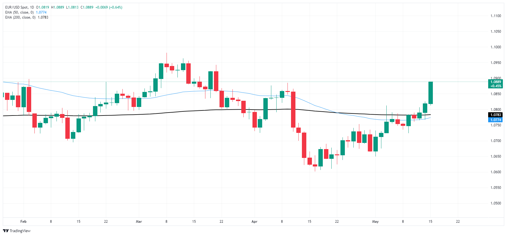 美国通膨回落美元承压,欧元兑美元触及 1.0900