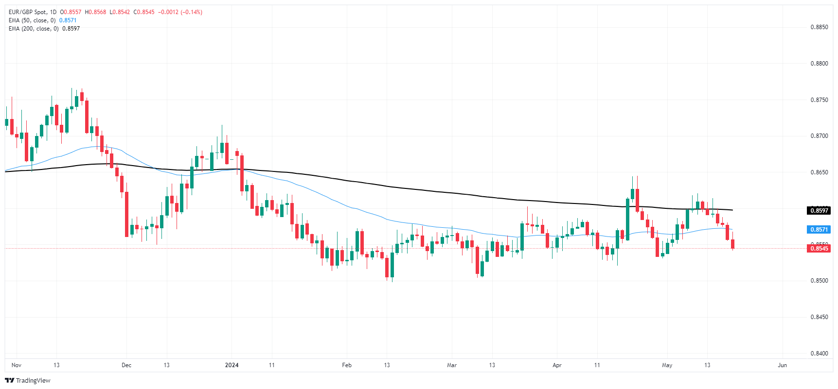 周一,欧元/英镑进一步下跌,跌破0.8550,欧元/英镑走低,欧洲央行(ECB)6月或7月首次降息的脚步越来越近。欧洲央行官员演讲要点為市场带来了不同的讯号,使欧元贬值,因為投资者正在努力应对货币政策决策者发出的不一致信号。
