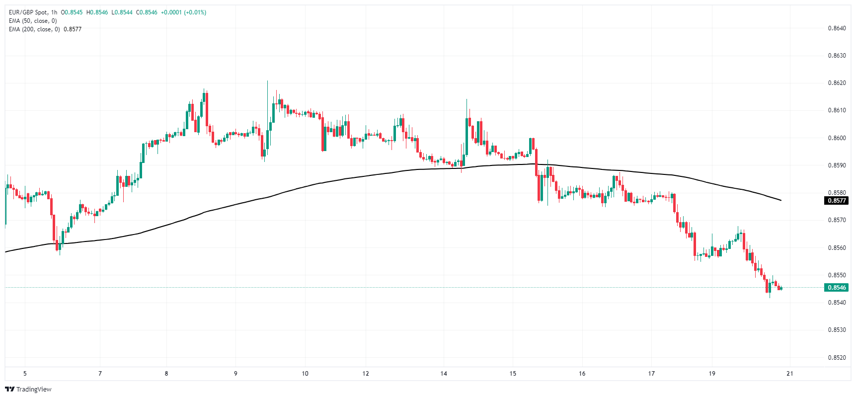 继跌穿 0.8590 附近的关键技术指标后,欧元/英镑正加速下行,跌破 200 小时指数移动均缐 (EMA)。 200 小时指数移动均缐转為看跌,接近 0.8577,若欧元/英镑跌破 0.8550,则进入熊市。