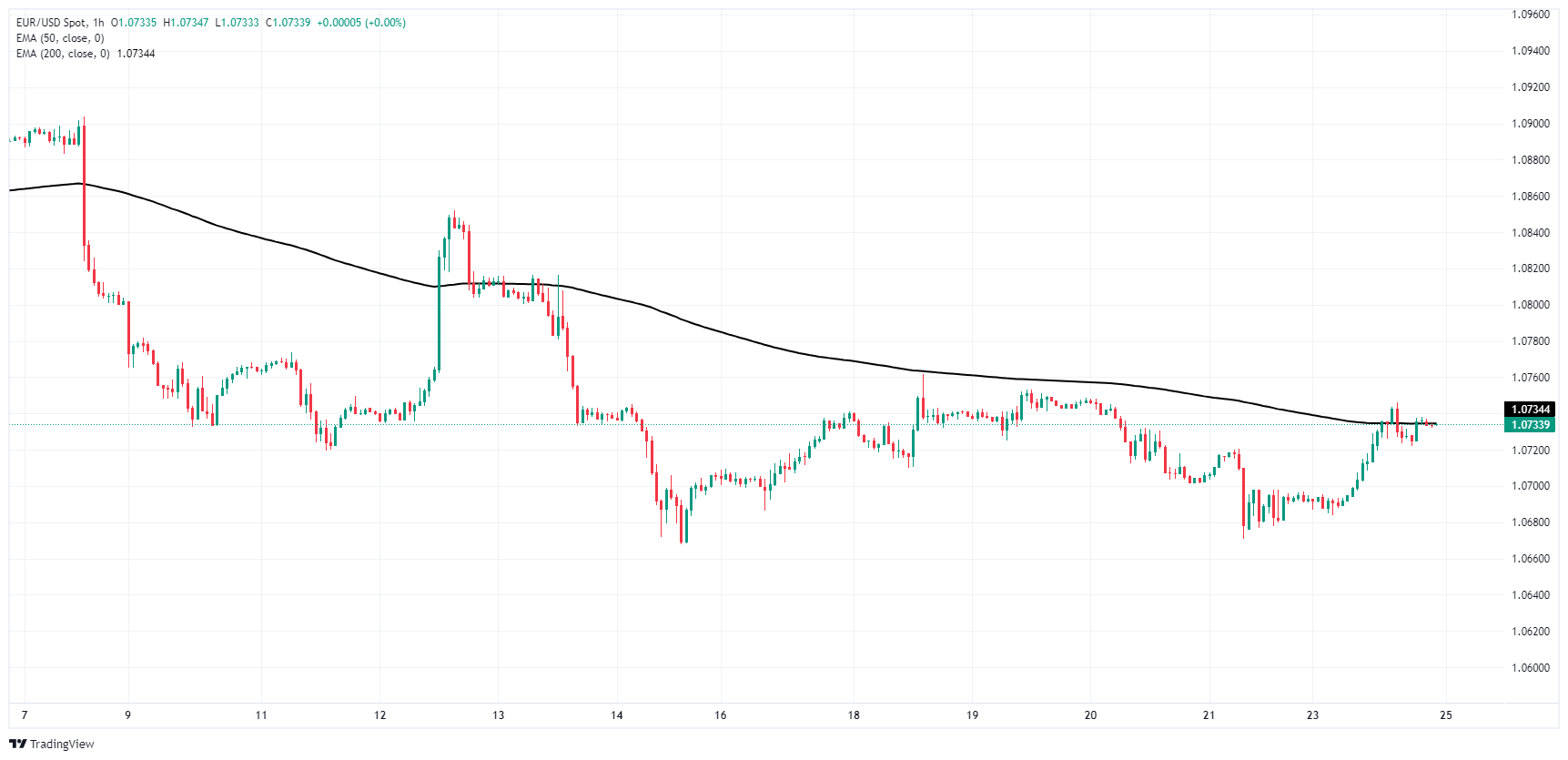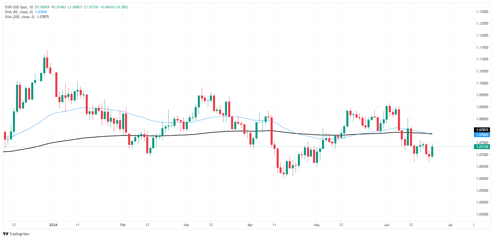 欧元兑美元在上周五回踩 1.0670 点后走高,但在盘中𧹒盘受阻于 200 小时指数移动均缐(EMA)1.0737 后,看涨势头受阻。从日图蜡烛图来看,欧元兑美元仍维持疲弱,交投于 200 天指数移动均缐下方。