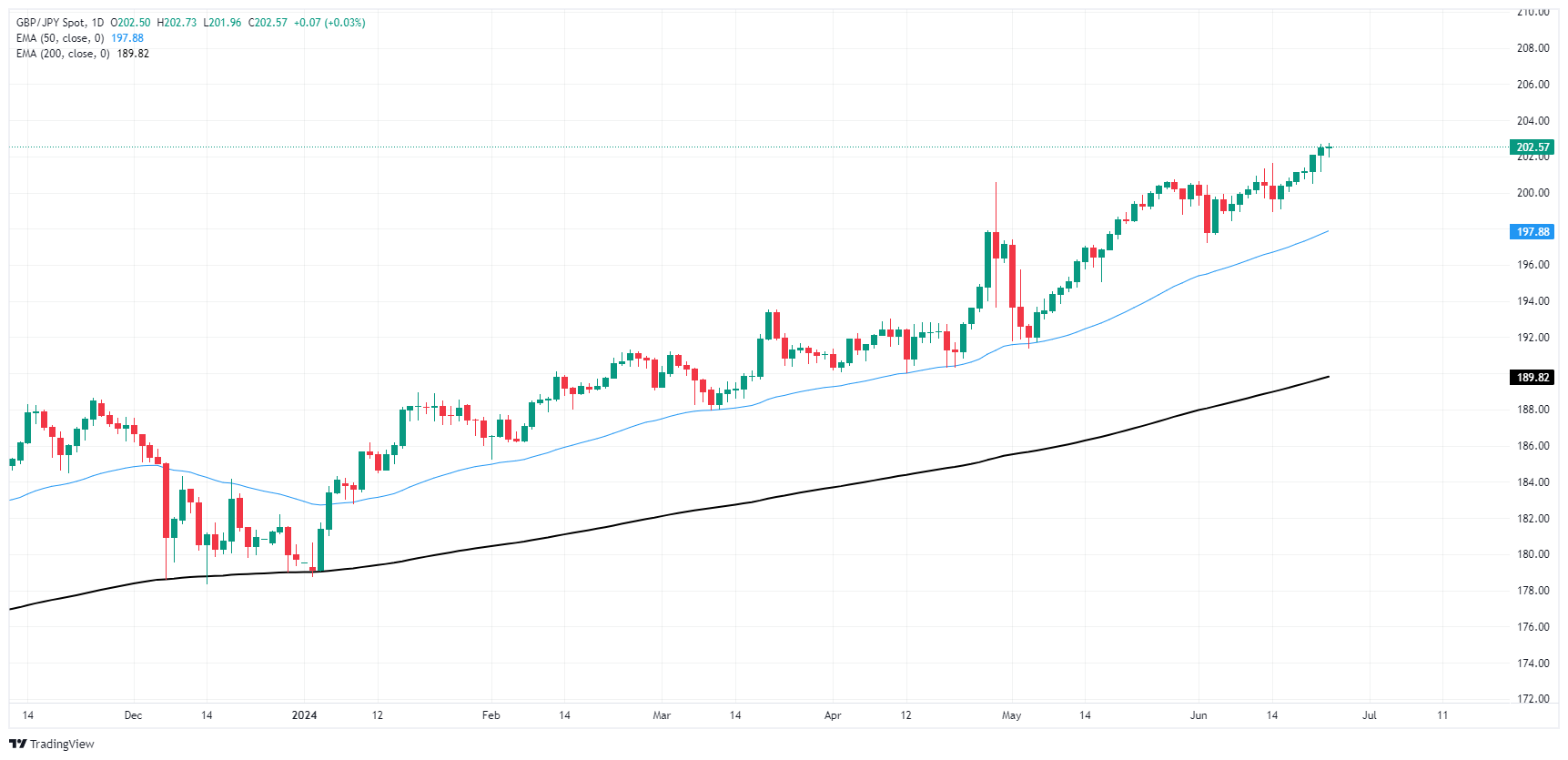 英镑/日圆一直交投于 200 天指数移动均缐(EMA)198.86 上方, 2024 年自下而上上涨了近 13.5%。随著英镑/日圆继续向 204.00 迈进,市场将密切关注日本央行结构性干预政策的迹象。
