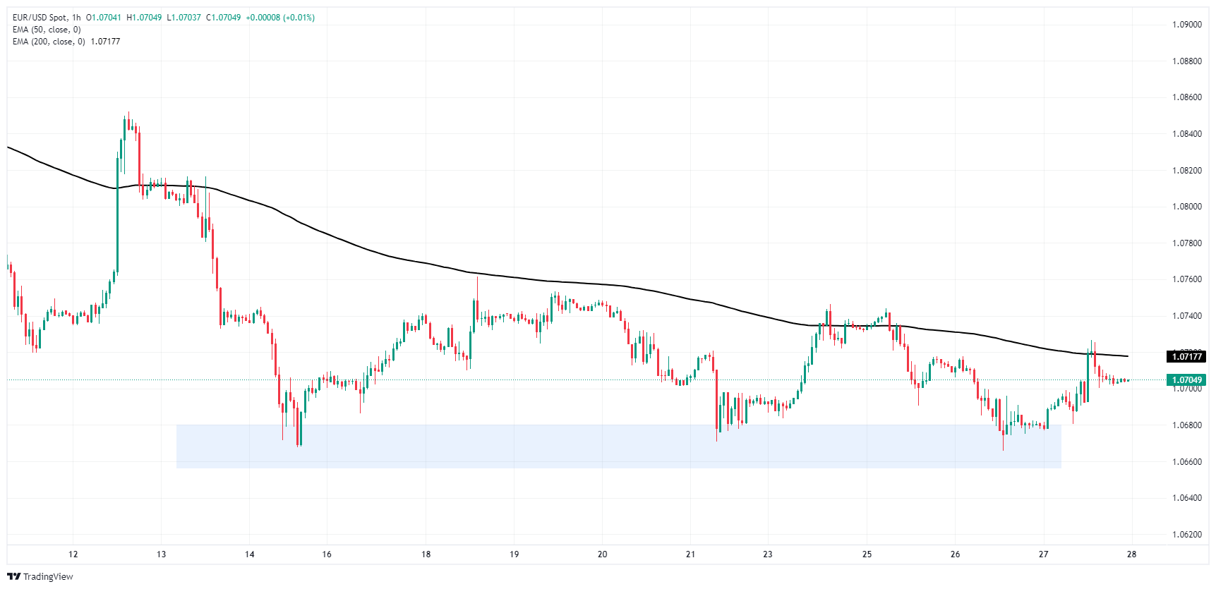 进入周五交易当中,欧元兑美元继周四从1.0680下方的需求区反弹后,重新站上200小时指数移动均缐(EMA)1.0717,然后回到1.0700关口。