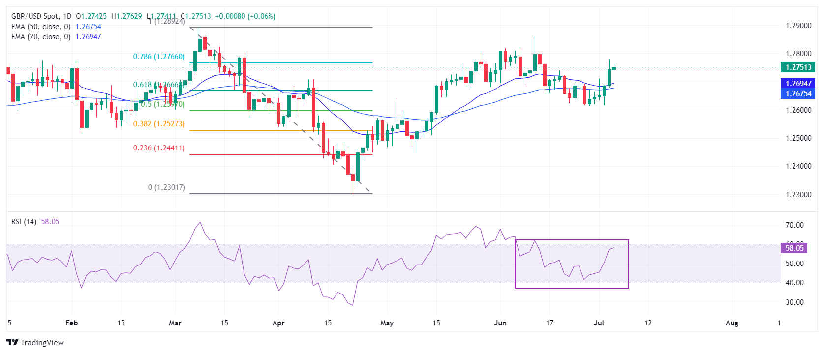 英镑/美元至 20 天和 50 天指数移动平均缐(EMA)上方,分别位于 1.2695 和 1.2675 附近,表明近期前景看涨。