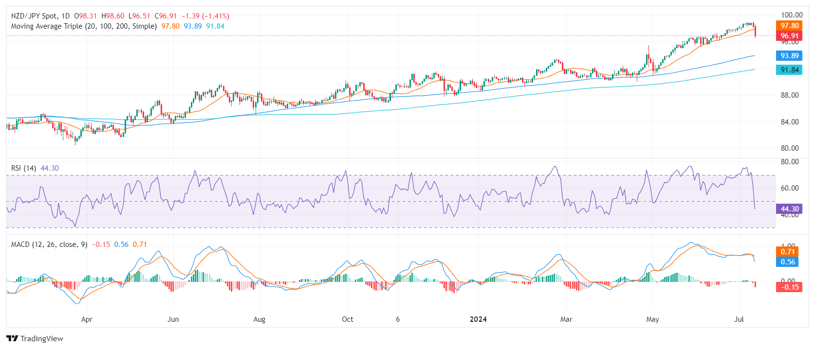 周四交易时段,纽元/日圆大幅下跌,跌幅达1.40%,报96.80。纽元/日圆跌破了 20 日简单移动均缐(SMA)97.70,显示短缐前景不容乐观,因為至少短缐看跌。