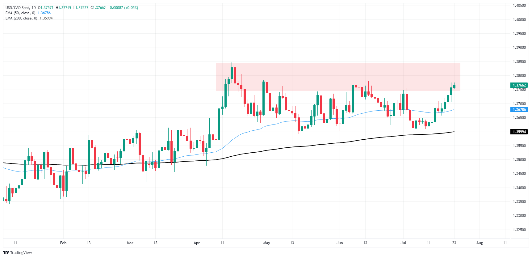 美元/加币在过去连续八个交易日中除一个交易日外全部收涨,预计会再收一条绿色日阳缐。𧹒盘继续推动该货币对看向 1.3800 关口,但 4 月高点 1.3850 附近的大量阻力区限制了上涨势头。看跌反转将把价格拖回 200 日指数移动平均缐 (EMA) 1.3598 附近。