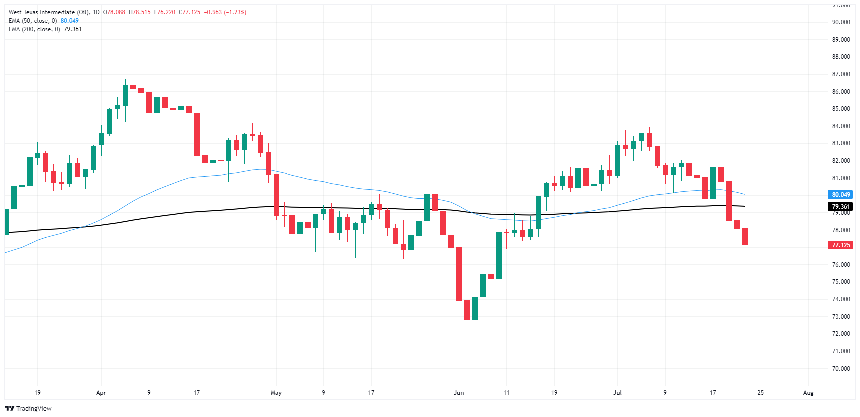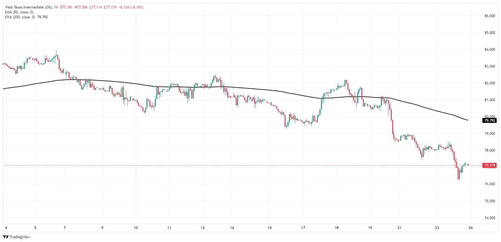 周二,西德州中质原油(WTI)短暂跌破 77.00 美元,随后略有反弹,这使得美国原油市场面临新一轮的大盘看跌。