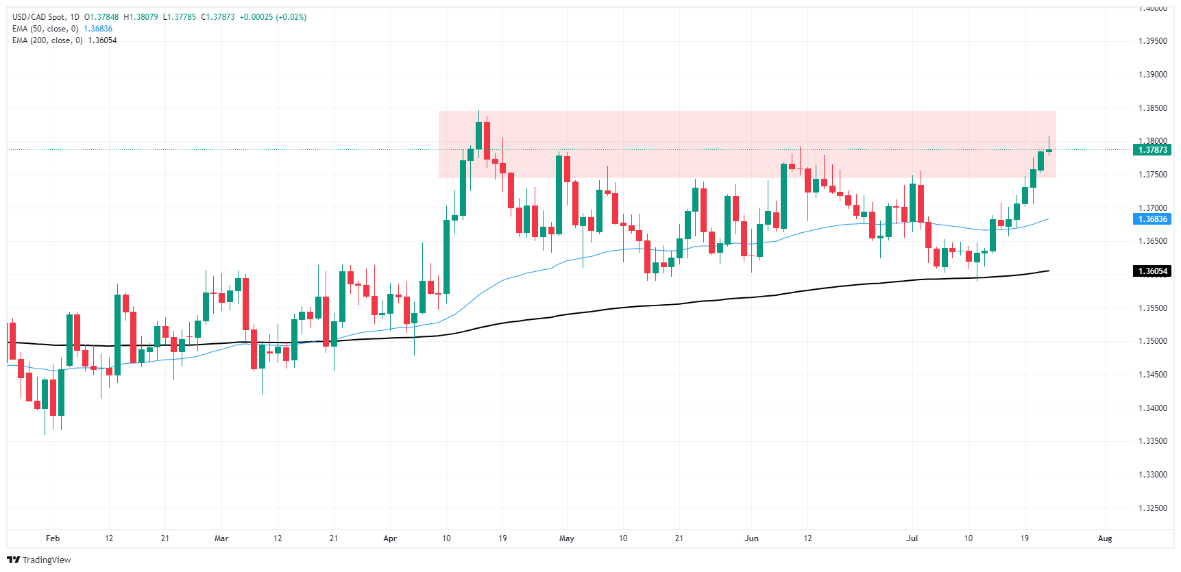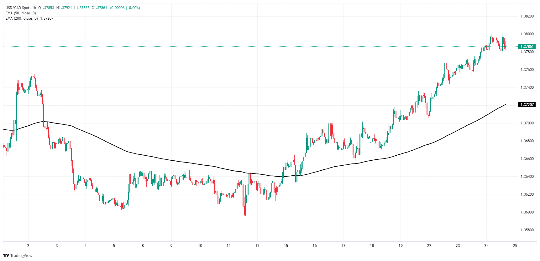 美元兑加币周三曾短暂升至14周高点,越过1.3800关口,随后回落到当天的𫔭盘区间。日内价格走势仍维持在 1.3780 上方,但势头越来越倾向于美元𧹒家。