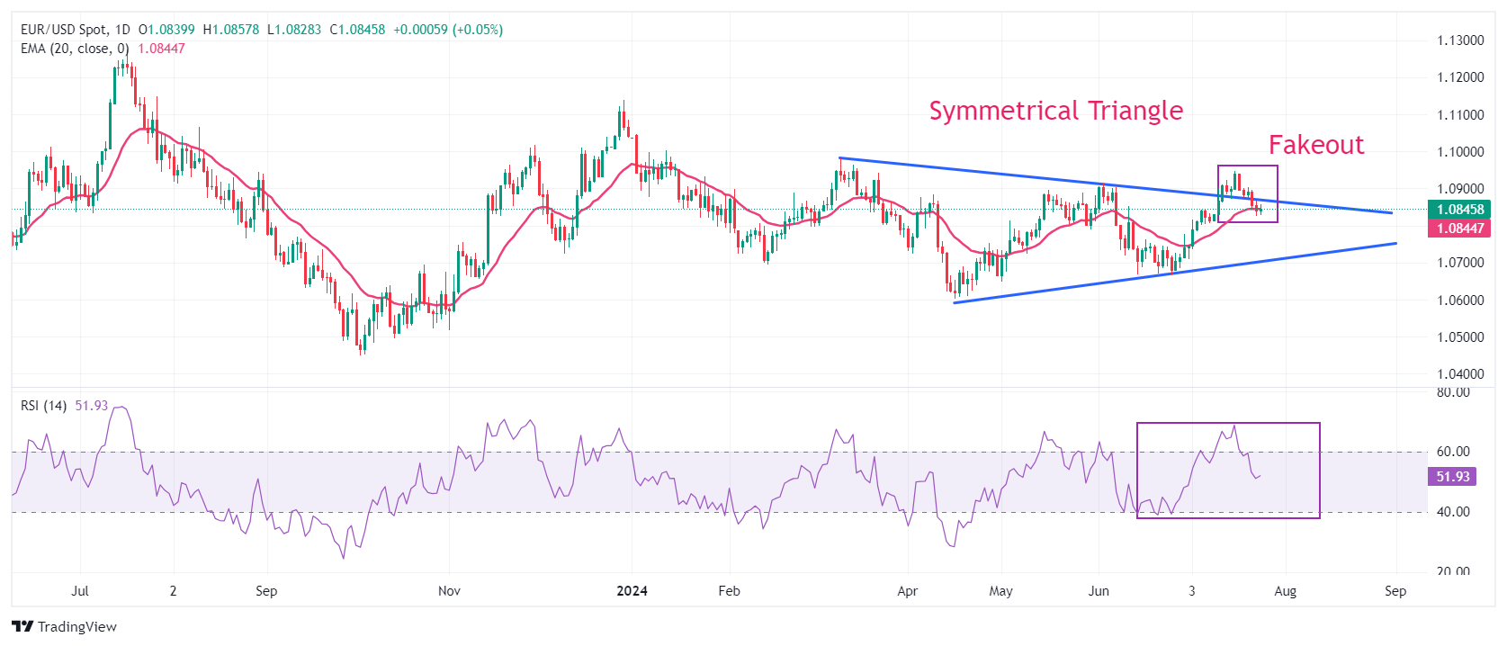 在未能有效突破后,欧元/美元重返日线图的对称三角形形态内部。该主要货币对下行幅度扩大至20日指数移动均线(EMA)下方,该均线在1.0840附近交投。该货币对可能进一步跌向 1.0800 和 1.0700 附近的整数关口支撑位。