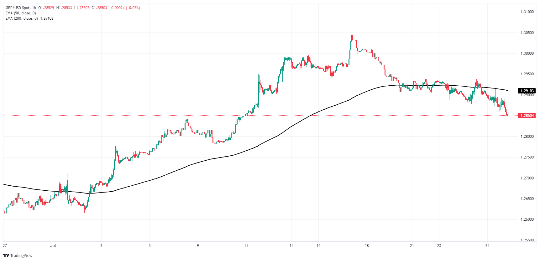 英镑兑美元从上周的 52 周高点 1.3045 附近下跌,录得-1.5%,英镑/美元预计将在过去六个交易日中连续五个交易日收红。随著英镑兑美元跌破 200 小时指数移动均缐(EMA)1.2910,日内交易已转為坚定看跌。