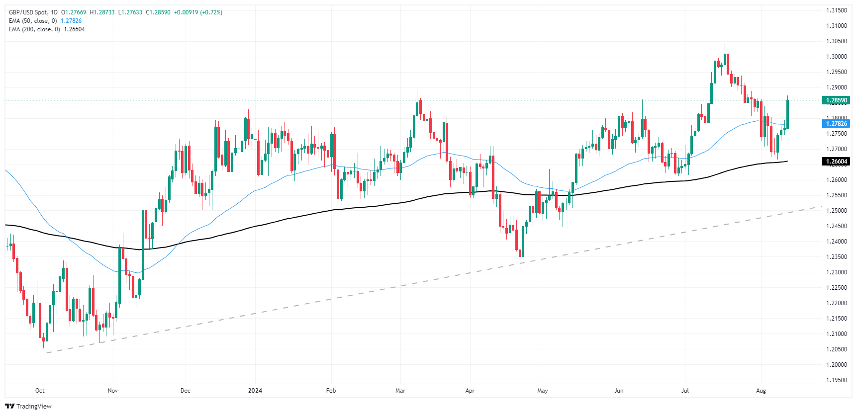 周二继市场情绪找到𧹒进按钮后,英镑兑美元上涨至两周高点,盘中最高升至1.2873。美国生产者物价指数(PPI)通膨降温幅度超过预期,促使市场纷纷押注联准会(Fed)将在9月加快降息步伐,而英镑/美元交易商则摆脱了英国申请失业救济人数达到多年最高水平带来的影响。
