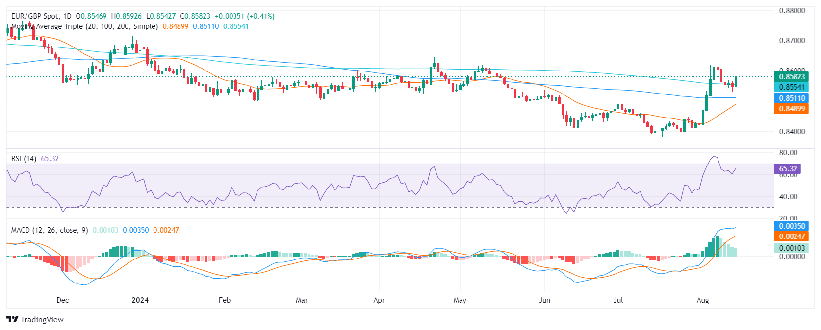 欧元/英镑在最近几个交易日整体呈现看涨趋势。欧元/英镑货币对的相对强弱指数(RSI)在中位数附近波动,显示多头正在积蓄力量,还有更多的路要走。 RSI 最高值约 62,暗示有轻微的过度𧹒盘。移动平均收敛背离指标(MACD)显示稳定的绿柱,确认了𧹒方的存在。