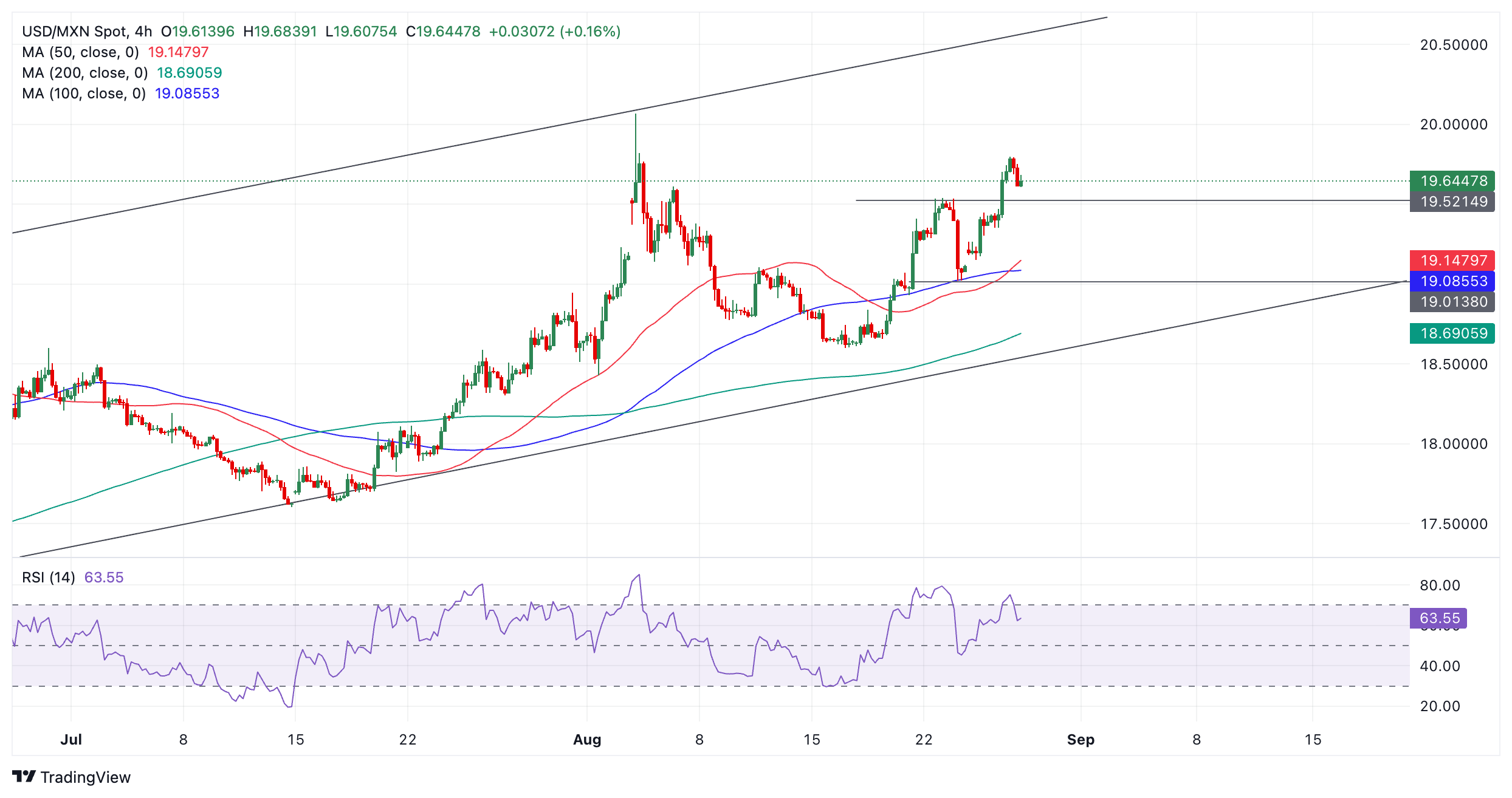 美元/墨西哥比索在上升通道内上行,已确立的上升趋势有利于多头而非空头。