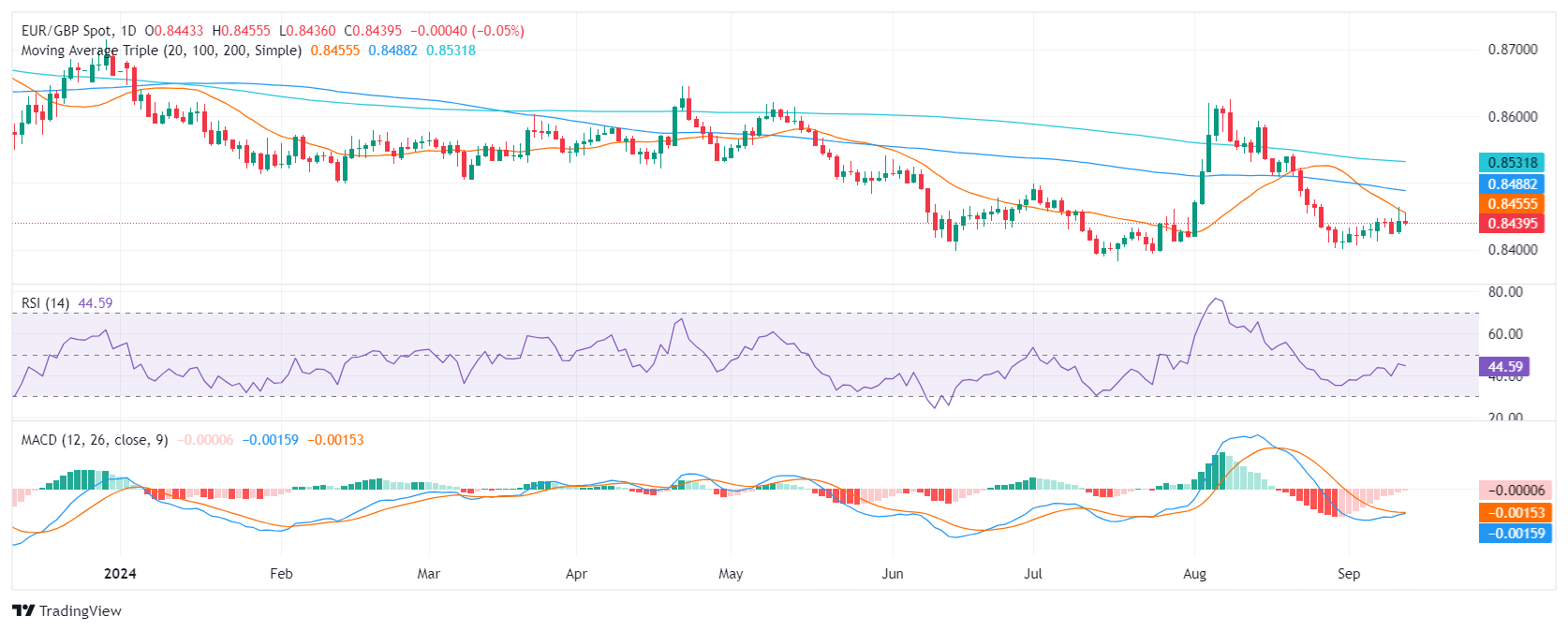 过去几个交易日,欧元/英镑一直在窄幅区间内盘整,在 0.8420 和 0.8450 之间波动。这种盘整表明近期缺乏明确的方向性倾向。如果该货币对成功突破 0.8450(20 日均缐)这一直接阻力位,则有可能将目标指向 0.8460 和 0.8470。反之,若跌破 0.8420,则可能进一步下探 0.8400。