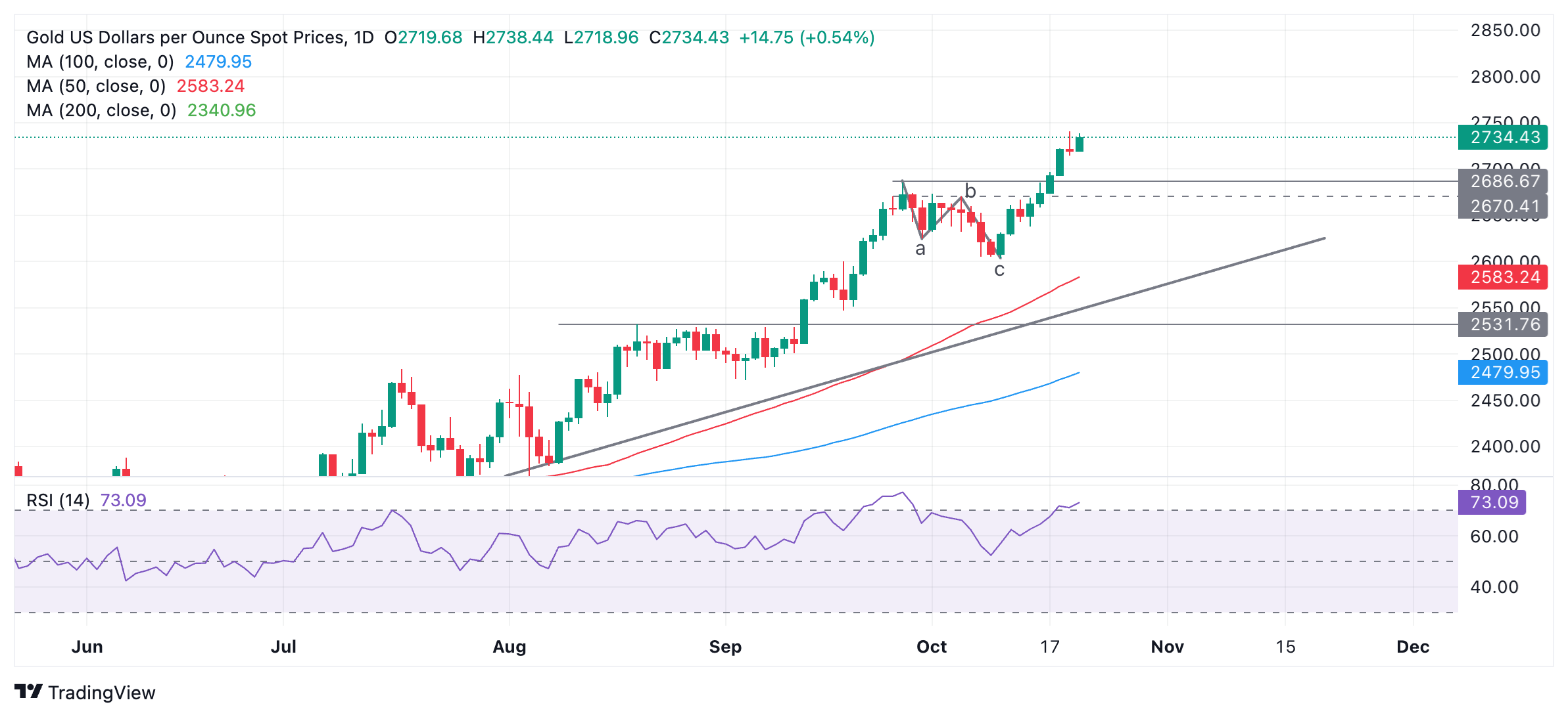 黄金在所有时间框架(短缐、中缐和长缐)上持续稳步上扬,在突破 2700 美元大关后,目前正向下一个目标 2750 美元进发。