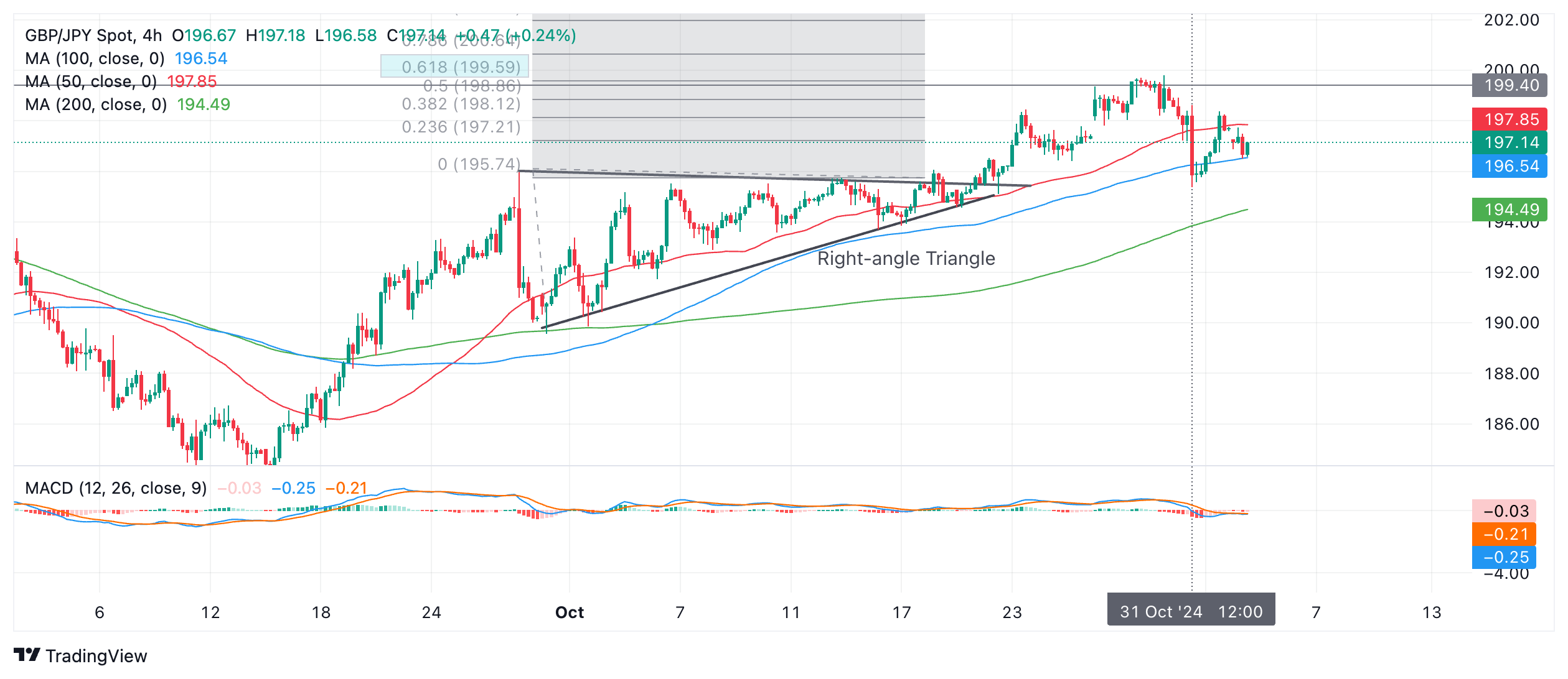 英镑/日圆在突破 10 月形成的直角三角形后上扬,并触及价格形态的最低预期价位199.59,即三角形最宽处高度的61.8% 斐波纳奇扩展位,更高(蓝色阴影矩形)。