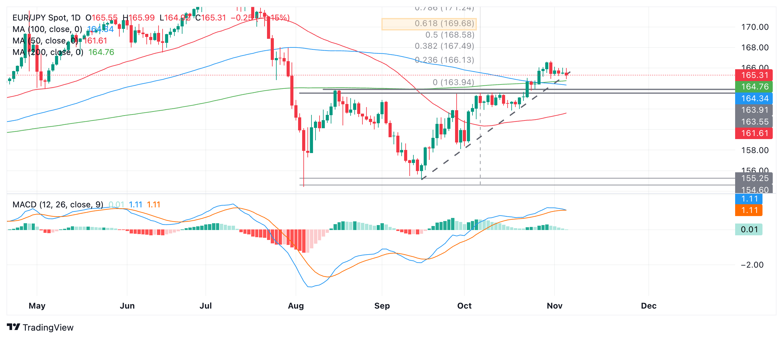 突破至 166.69(10 月 31 日高点)上方可能会确认持续走高。