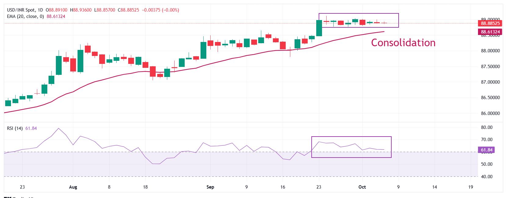 美元/印度卢比(USD/INR)在89.00附近摇摆超过一周。该货币对的短期趋势依然看涨,20日指数移动平均缐(EMA)在88.62附近向上倾斜。