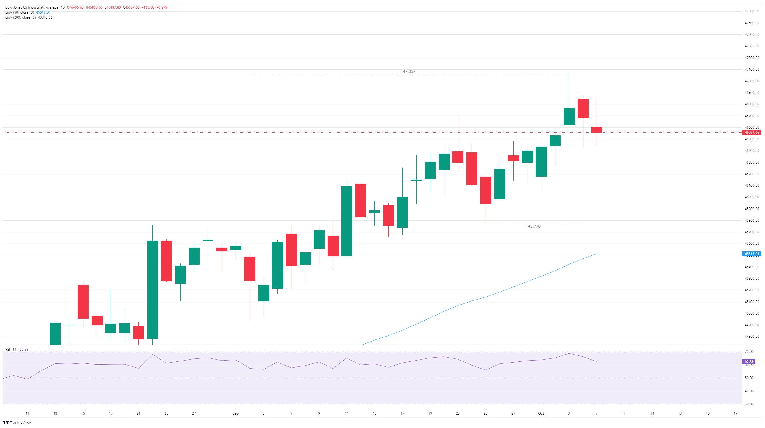 道琼斯在周二𫔭盘时从46,800以上的高点大幅下跌,跌幅超过420点,最终在46,430找到日内支撑。道琼斯指数目前在46,500附近寻找反弹机会。