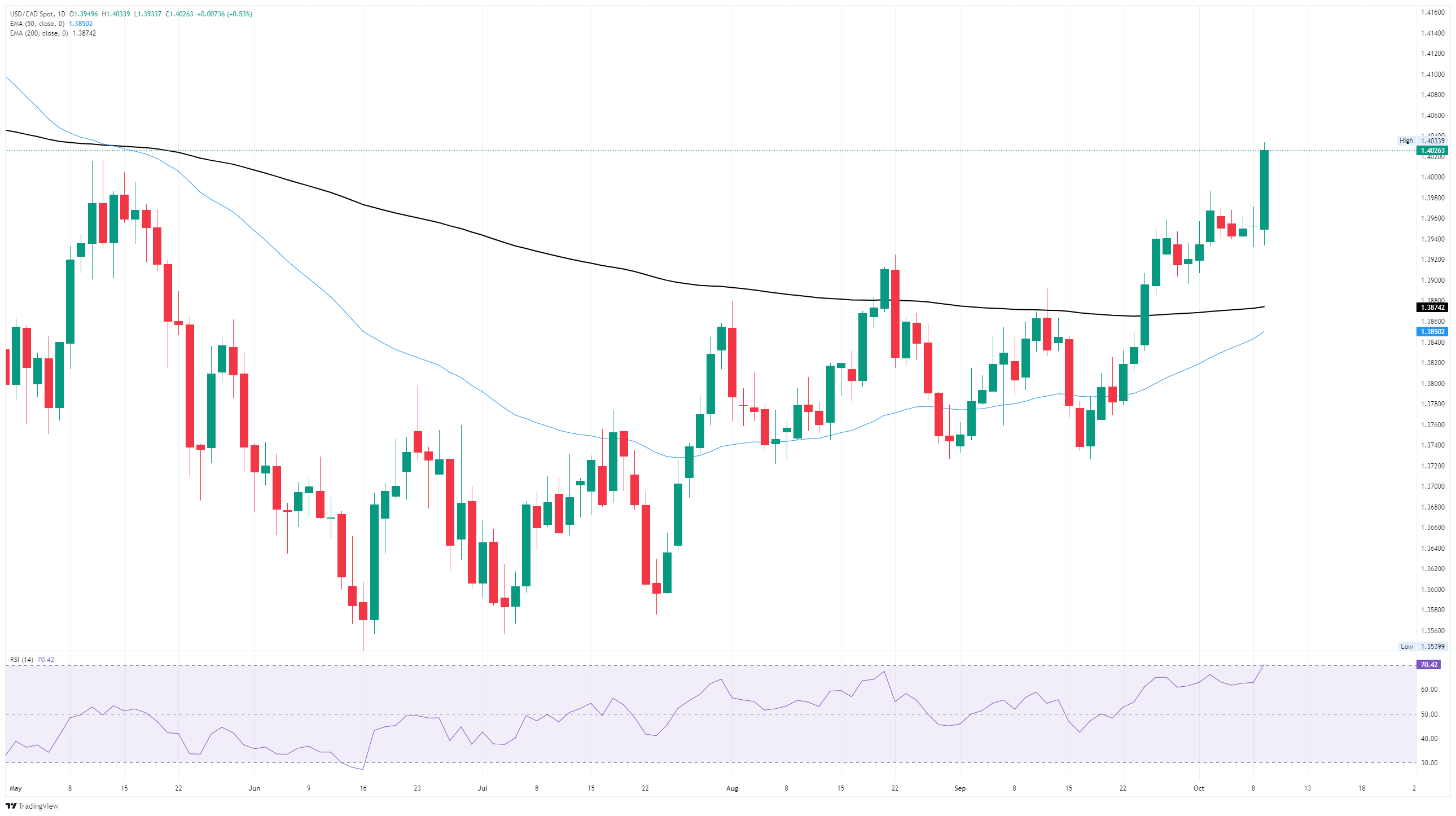 美元/加元延续了近期的反弹,目前交易接近1.4025,突破了关键的1.4000水平。这一走势标誌著日内结构的决定性转变,价格已突破50日和200日指数移动平均缐(EMA),分别聚集在1.3850和1.3870附近。该区域已从阻力转变為潜在支撑,表明市场情绪向美元转变。