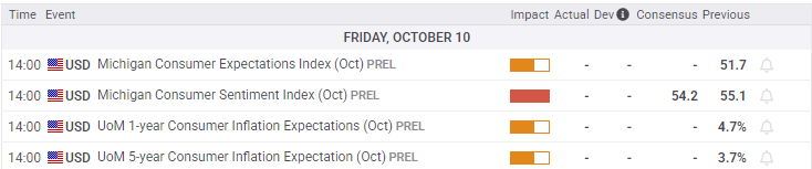 政府停摆还限制了官方数据集的发布,使市场不得不更加关注私人数据集。本周的关键发布将是密歇根大学(UoM)10月份消费者信心指数,定于周五发布。预计综合消费者调查结果将略有放缓,因為持续的贸易𢧐头条和上升的通胀压力正在侵蚀消费者信心。