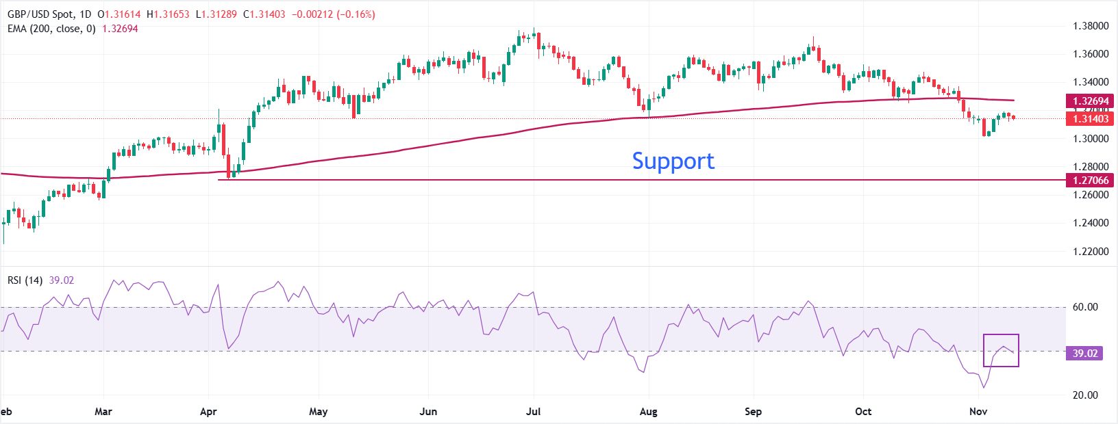 周三,英镑兑美元下滑至接近1.3115。该货币对的整体趋势仍然看跌,因為其交易价格低于200日指数移动均缐(EMA),该均缐约為1.3269。
