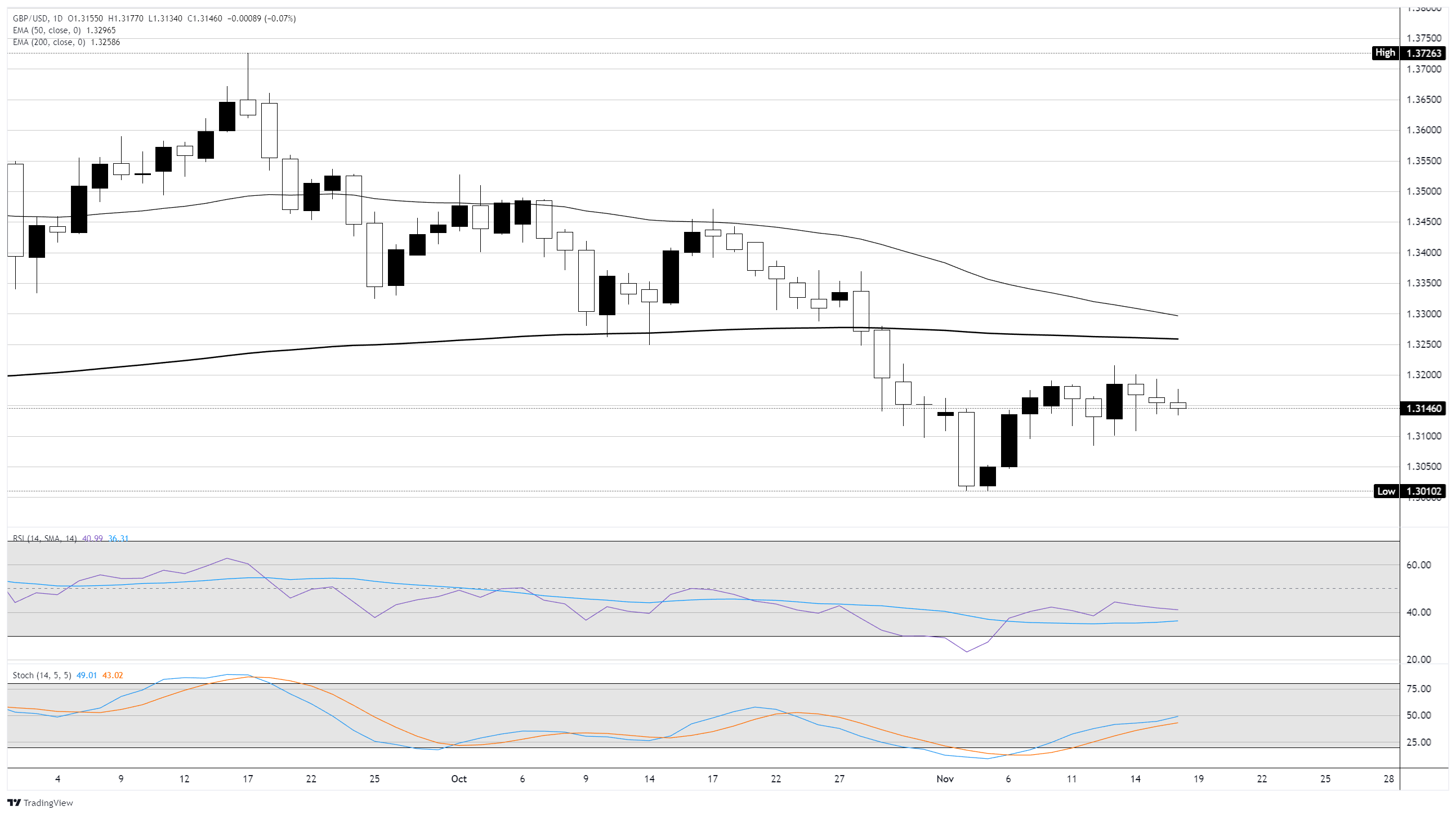 英镑/美元仍然被困在一个粗略的短期盘整区间内,英镑在1.3150区域的𧹒盘循环。该货币对在从七个月低点反弹后失去了动力,英镑在11月保持基本不变。