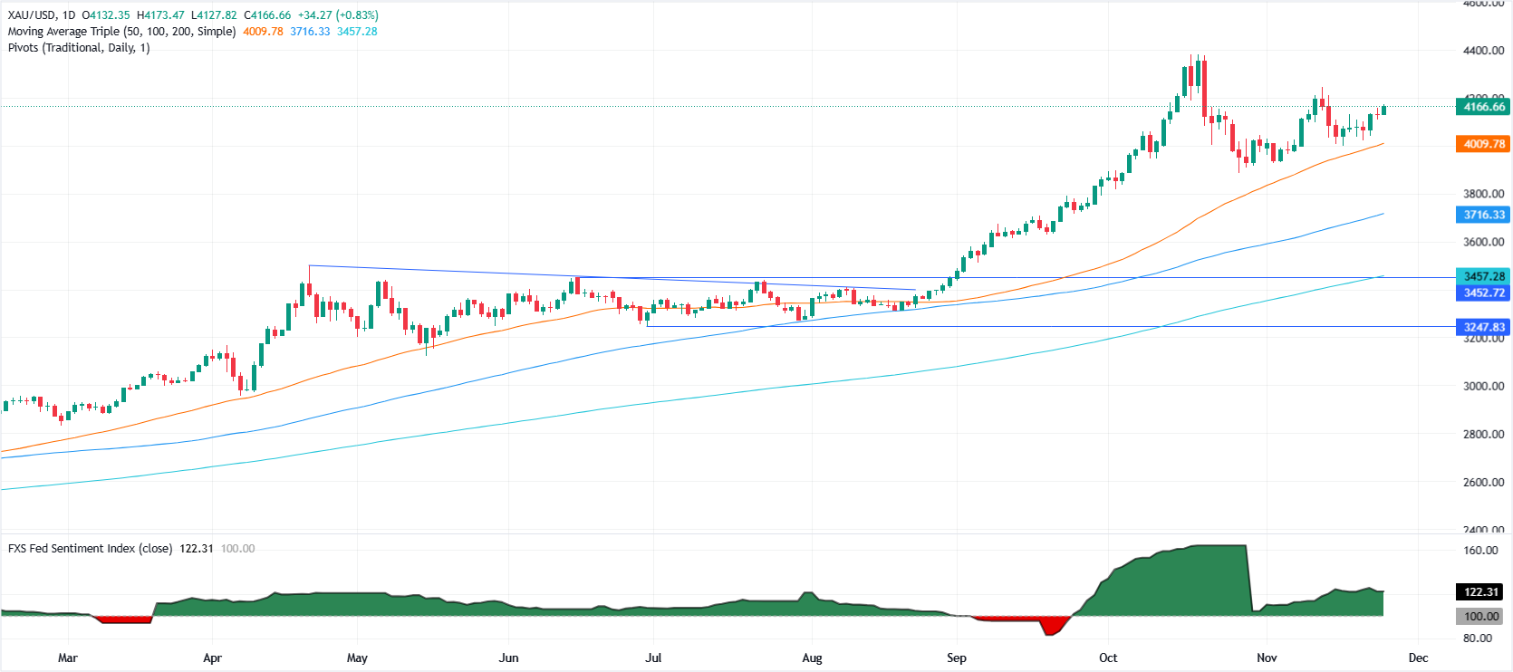 黄金价格继续在4,100-4,190美元区间内整固,未能突破4,200美元大关。侭管动能支持进一步上涨,如相对强弱指数(RSI)所示,但𧹒家缺乏推动XAU/USD重新测试历史高点的力量。