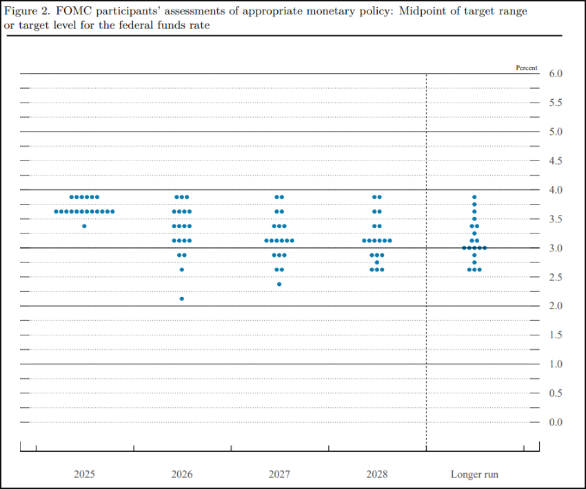 侭管美联储的利率预期点阵图已扩大,但联邦公𫔭市场委员会(FOMC)的预测与上次更新基本保持不变。政策制定者的中位数预期是在2026年进行一次降息,随后在2027年再降一次,之后利率将在大约3.0%的长期水平上稳定。