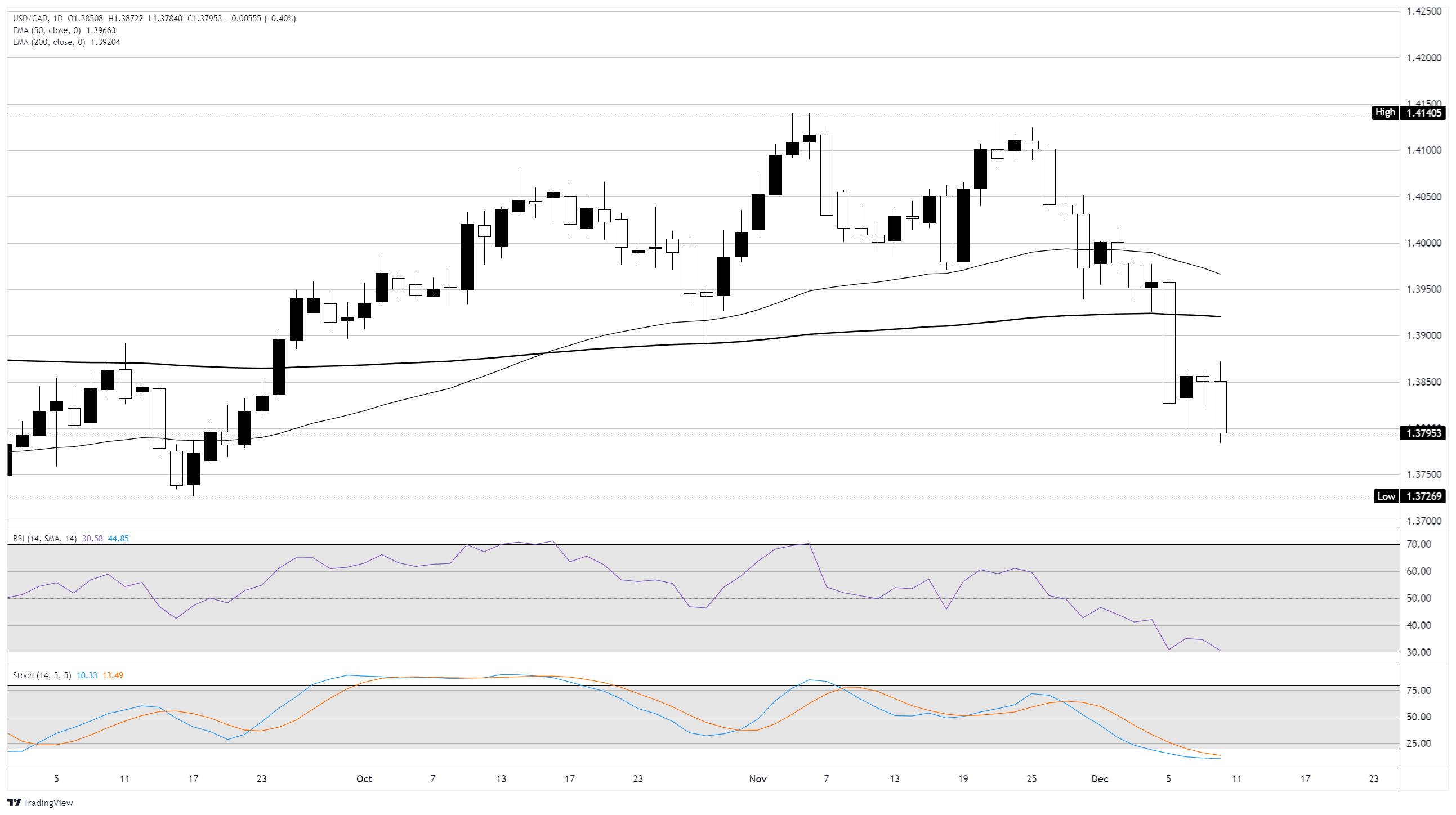 图表上可见的下一个关键水平是1.379–1.372的支撑区,由近期低点和历史价格反应所突出。若持续跌破该区间,将发出持续趋势疲软的信号,而若稳定在该区间之上——结合RSI或随机指标的动量反转——则可能暗示潜在的盘整,而非完全的趋势转变。就目前而言,动量仍倾向于下行,交易者通常会关注超卖指标是否𫔭始回升,或价格是否继续加速下行。