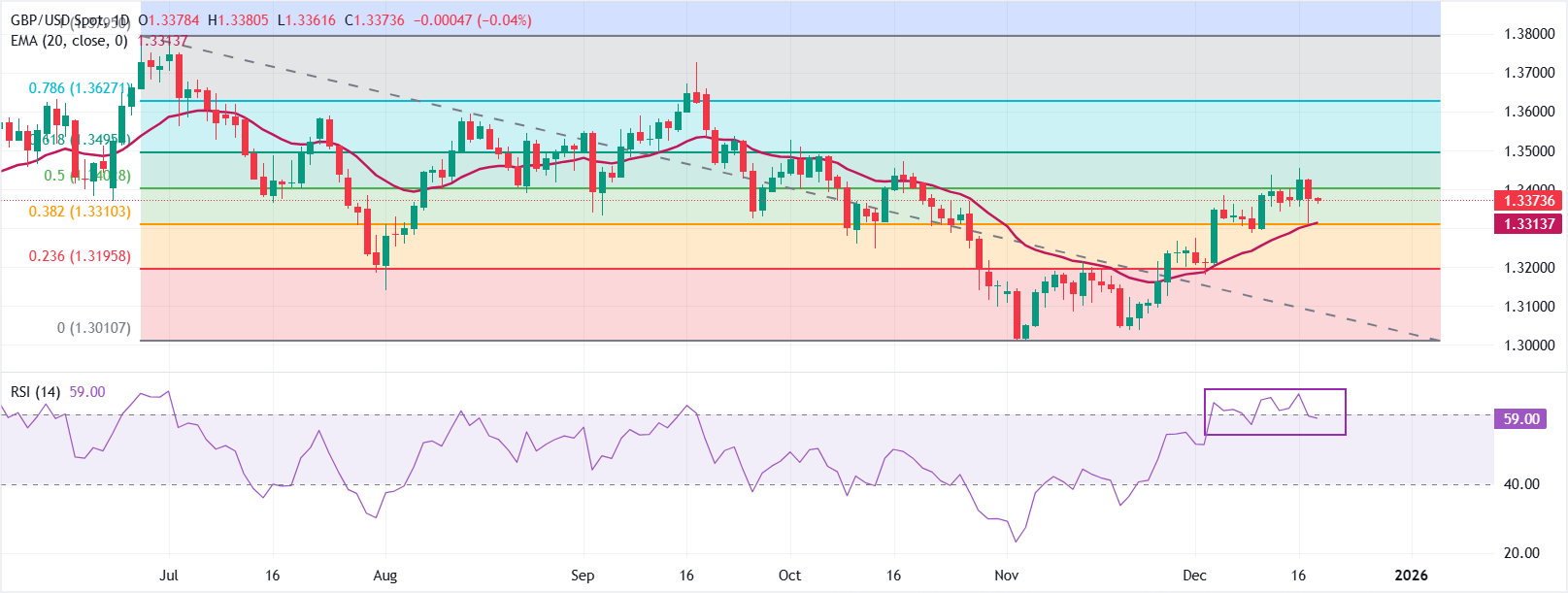 周四,GBP/USD小幅下跌至1.3374。20日指数移动平均缐(EMA)在1.3314上升,价格保持在其上方,保持上行偏向。若持续收盘在该均缐之上,将维持反弹,而回调至该均缐将测试近期支撑。