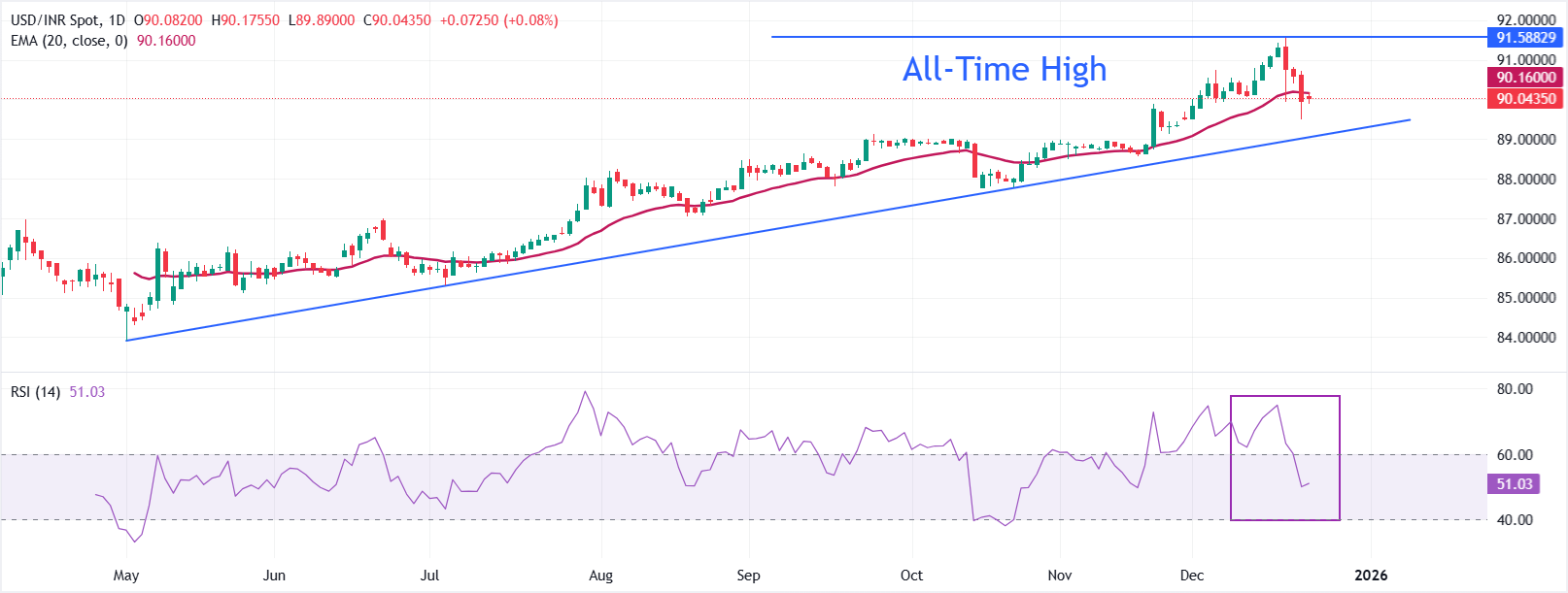 美元/印度卢比在本周初谨慎交易于90.0440附近。20日指数移动平均缐(EMA)上升,侭管价格已轻微跌破90.1601,抑制了近期的上涨势头。自83.9122以来的上升趋势缐支撑了更广泛的偏向,支撑位在89.1107附近。