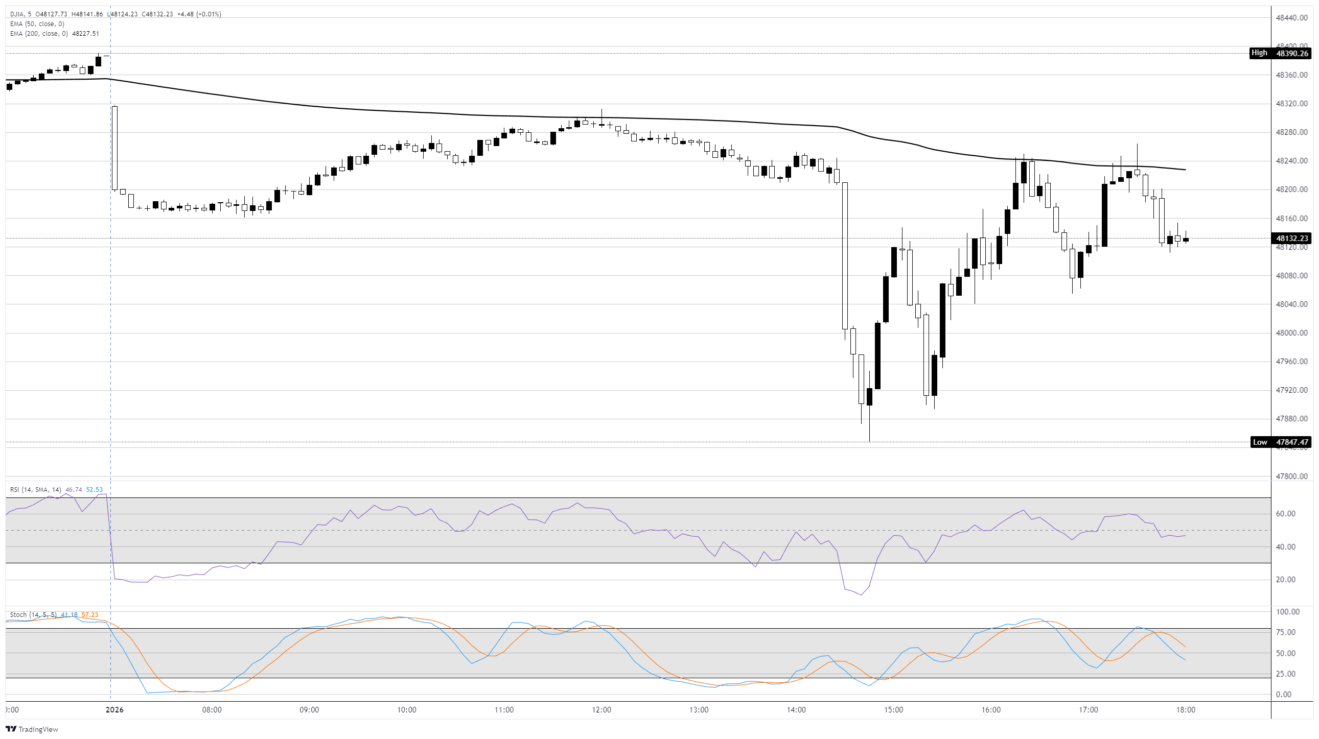 美国股市在2026年以谨慎的态度𫔭盘,标准普尔500指数和纳斯达克基本持平,半导体的强劲表现抵消了其他科技股的疲软。道琼斯指数在周五经历了早盘的急剧下跌后找到了支撑,保持在2026年首个交易日的起始水平附近。