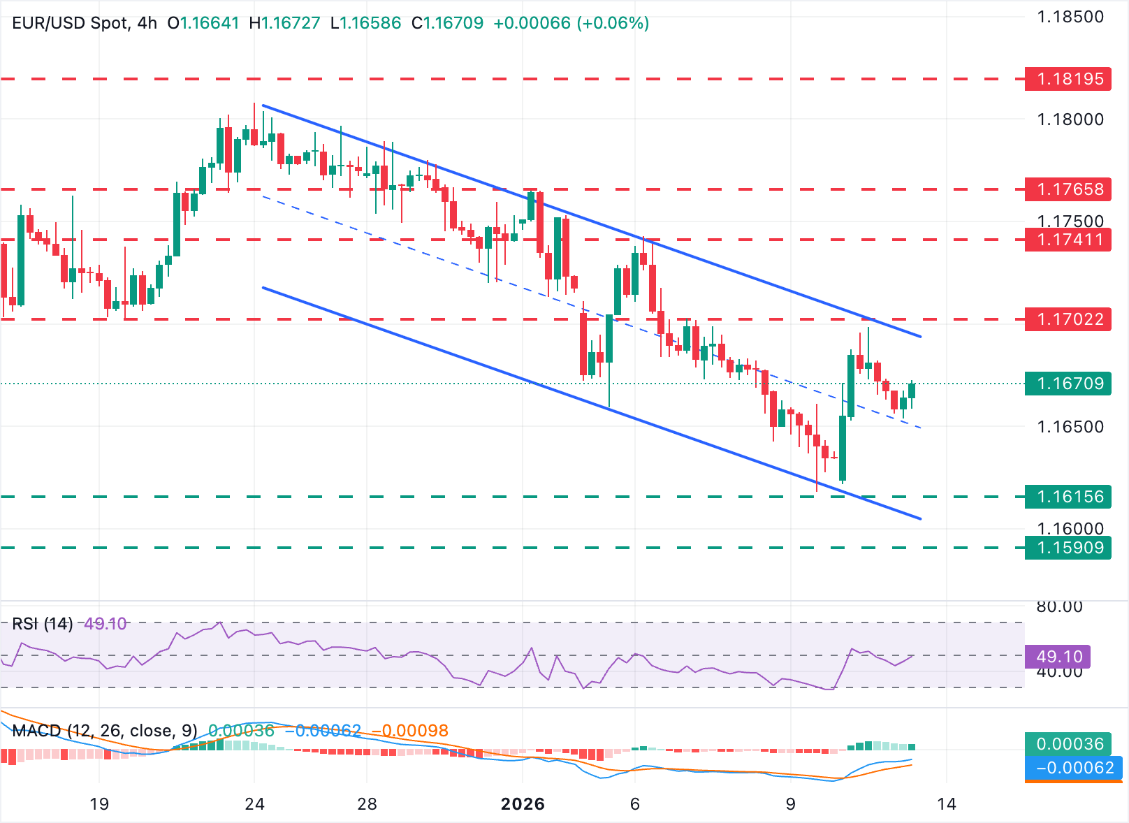 日内低点1.1653可能会提供一些支撑,接下来是周五的低点1.1618和通道底部,目前在1.1600区域。向上看,趋势缐阻力现在在1.1694,略低于周一的高点。若确认突破该水平,将為看向1月6日的高点(1.1740区域)铺平道路。