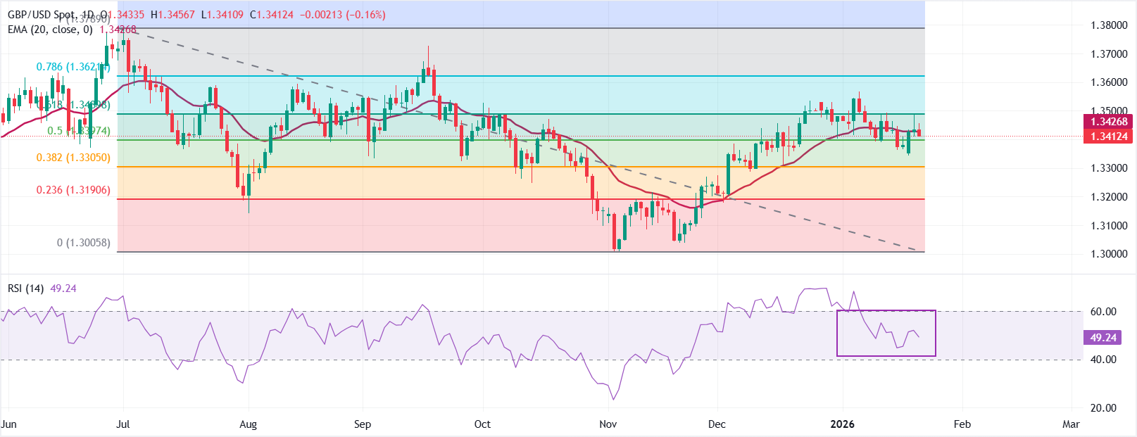 截至发稿时,GBP/USD交易价格接近1.3405。价格略低于20日指数移动平均缐(EMA)1.3429,该均缐在稳步上升后已趋于平坦,显示出盘整信号。