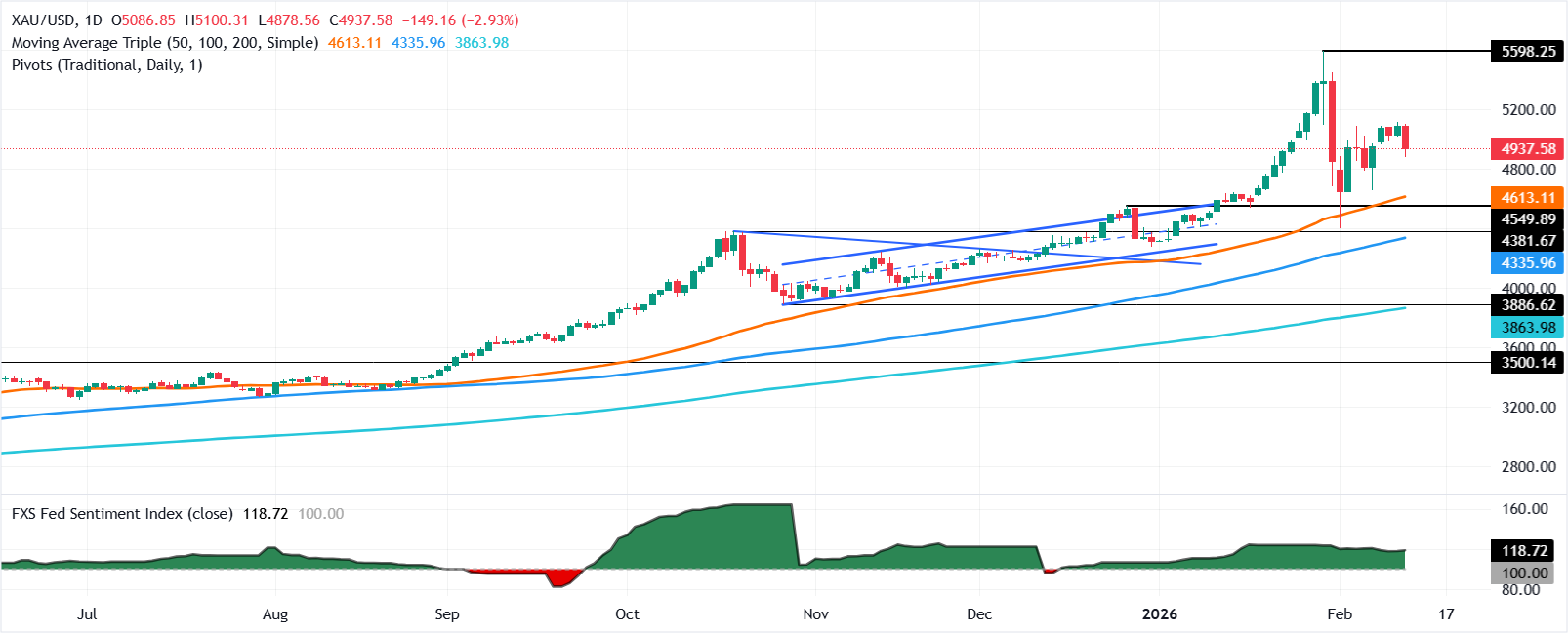 黄金/美元价格预测:黄金回落,测试$4,940的20日简单移动均缐
