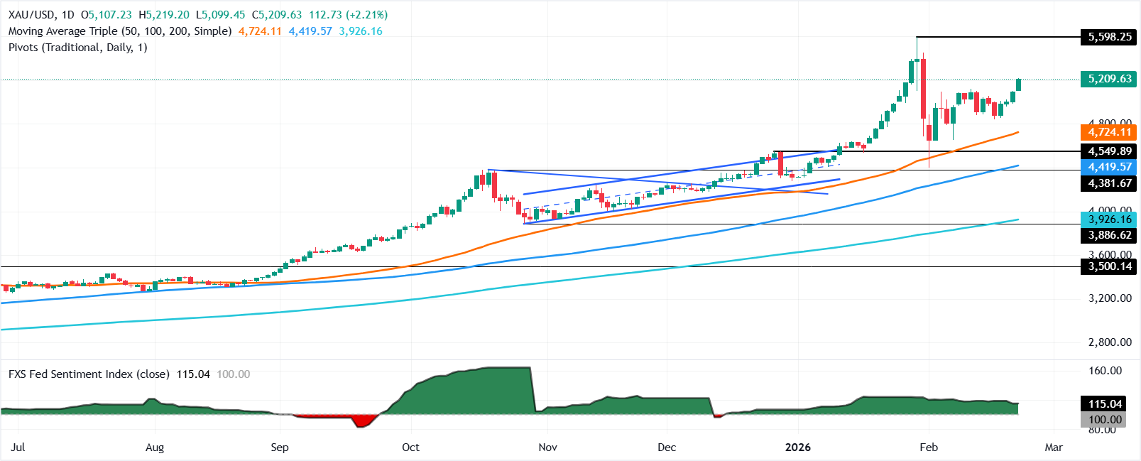 突破5200美元将暴露5250美元,随后是1月30日的高点5451美元。在进一步强劲的情况下,下个目标是5500美元,随后是接近5600美元的历史高点。相反,如果黄金/美元跌破5100美元,首个支撑位将是20日简单移动平均缐(SMA)在5025美元,随后是100日SMA在4702美元。