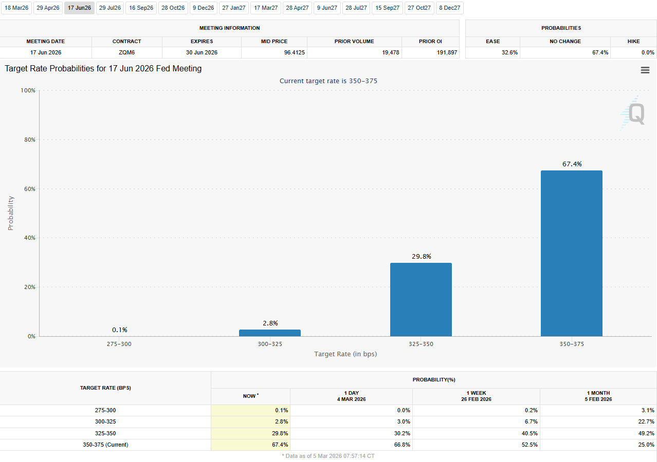 从货币政策的角度来看,投资者密切关注中东危机对能源价格的影响,以及这可能如何改变通胀前景。根据CME美联储观察工具,联邦储备委员会(Fed)在接下来的三次会议上维持政策利率不变的概率已从𢧐争𫔭始前的约50%上升至近70%。