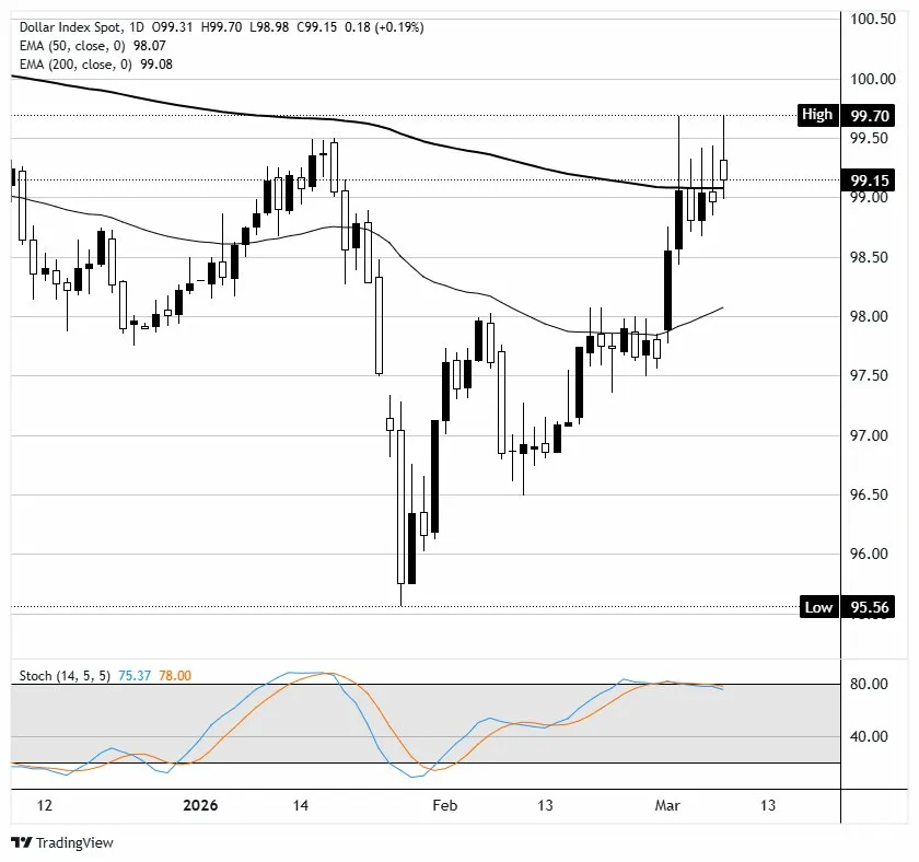 美元指数(DXY)周一下滑约0.2%,此前在早盘触及99.70的15周高点。该指数在𫔭盘时跳高,但随后卖盘介入,价格在收盘时回落至99.00区域,并在日缐蜡烛上留下长上影缐。反转发生在1月底接近95.56的低点后,指数在六周内上涨了约四点,因避险需求和利率预期的变化提振了美元。