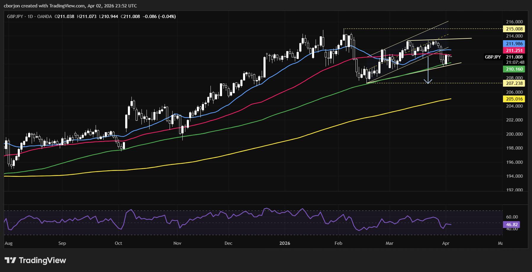 由于美国总统唐纳德·特朗普透露美军任务将延长两到三周,中东地区紧张局势加剧,风险偏好转差,英镑/日元在211.00附近盘整。
